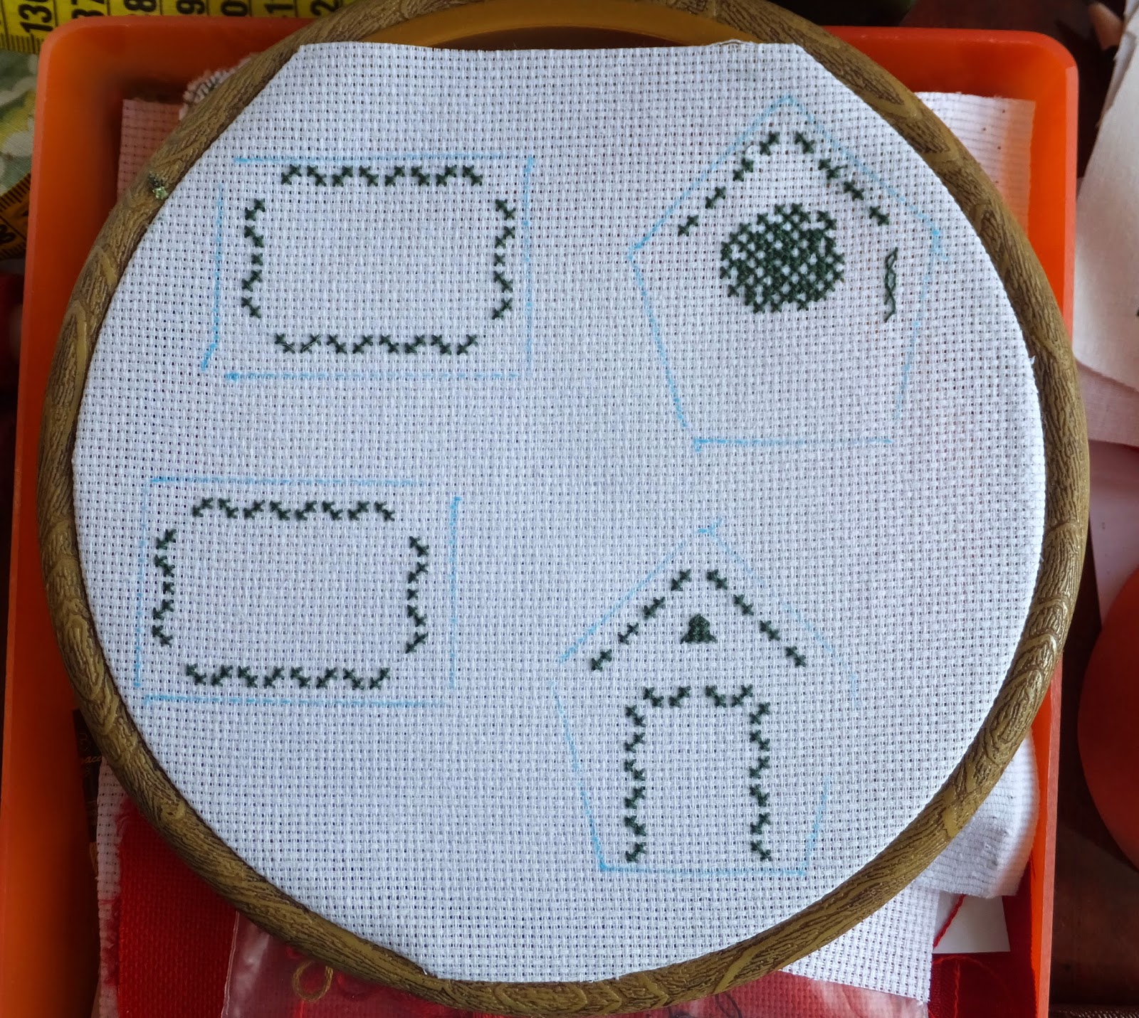 Шишечку, домик и сердечки  начала вышивать еще к прошлому НГ, но не успела закончить. Надеюсь в этом году справлюсь.